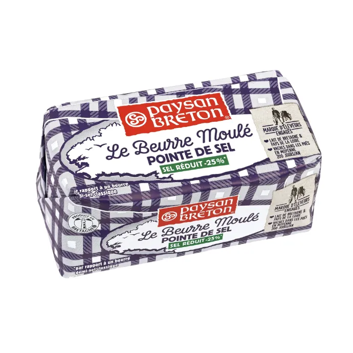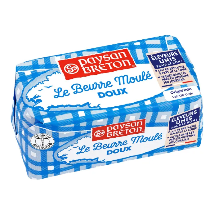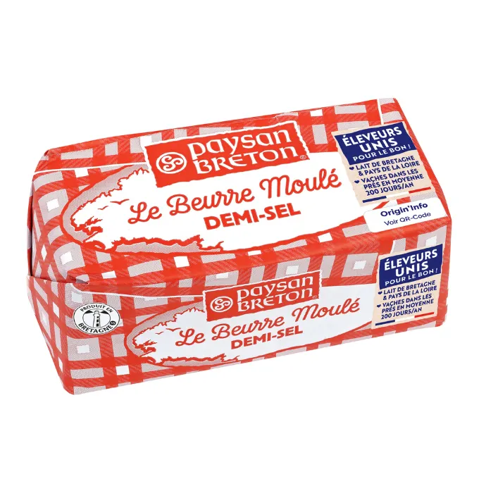 Butter made in Ancenis (Pays de la Loire, in Western France), with fresh cream from fresh milk collected from Paysan Breton farms, located in a perimeter of 80km from the Paysan Breton dairies.